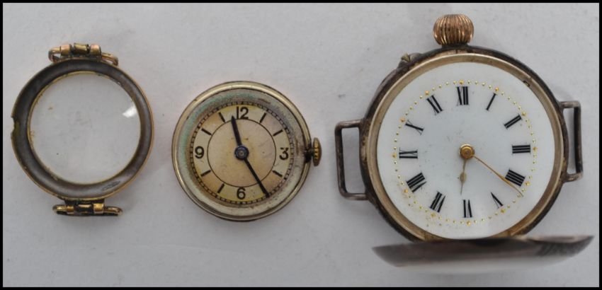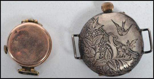 A vintage 20th century hallmarked 9ct gold cocktail watch having faceted hands with a silvered dial along with a continental silver watch having a white enamel facet with Roman numeral chapter ring and gilt faceted hands, the case having chased decoration of flowers and birds, stamped 935 to interior. Weighs individually 8.4 grams and 26.4 grams. Widest measures 4 cm.