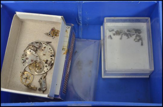 A collection of pocket watch parts to include movements, dials, cogs, Lanco gold movement, screws etc. Box measures 5 cm high, 22 cm wide and 14 cm deep.