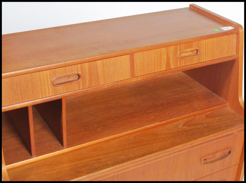 A 1970's teak wood bureau comprising of two short drawers above pigeon hole section with pull out rest over three straight drawers raised on round tapered legs and fitted frieze.