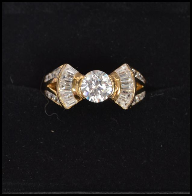 A group of three sterling gilt silver 925 dress rings, one having a central blue faceted stone, one having a central red faceted stone and the other having a central clear stone. Sizes Q, O and O. Complete in presentation boxes.