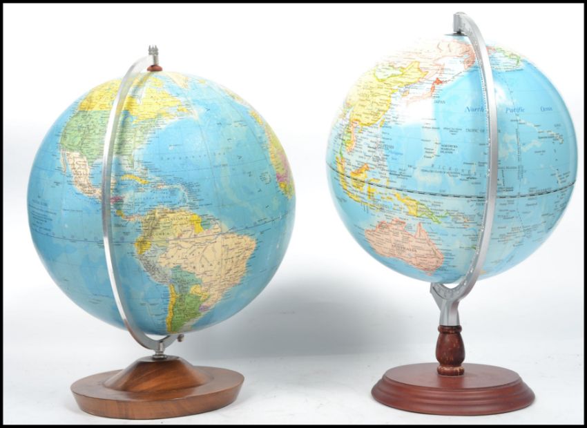 A vintage 20th century retro 1980's Political desk top globe on circular base along with another of similar form.