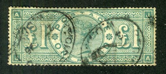 GB STAMP Queen Victoria 1891 £1 Green . Sound used example. 1895 registered cancels. Well centred & good perforations. Cat £800. SG 212