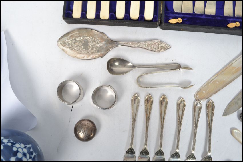 A collection of hallmarked silver items and silver plated flat ware to include cased sets, cake server, sugar nips, napkin rings, perfume bottle lid etc. Please see images.