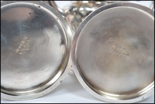 A collection of silver plated items to include a tea set, a pair of Victorian tankards with V R 37 stamps, two trays, two cased carving sets,  a Sheffield plate chamberstick etc. Please see images. Highest measures 8 cm.