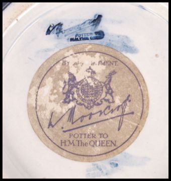 A good 1930's Moorcroft pottery bulbous shaped vase being decorated in the Freesia pattern having a flambe glaze. The base with impressed stamp mark used with facsimile signature and having ‘ Potter to HM Queen ’ at bottom right alongside the early version of the Royal Warrant paper label – ‘ Potter To HM The Queen ' dating this to 1928 - 1936. Measures approx 21.5cms high