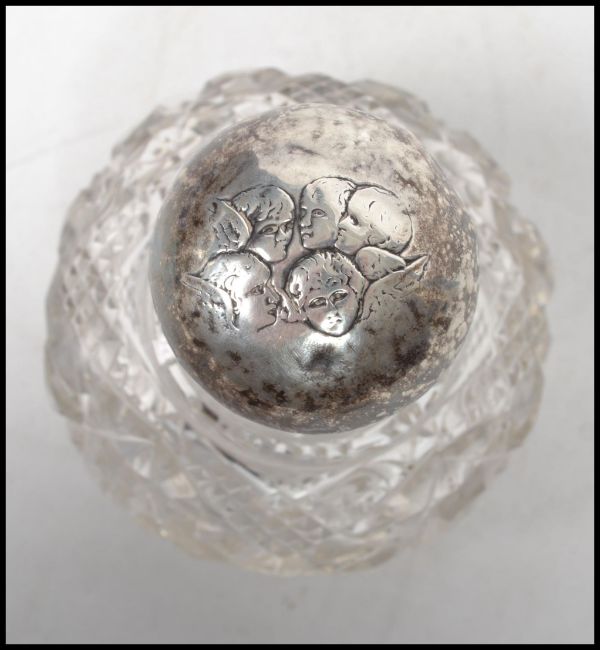 A 19th century silver topped cut glass perfumer bottle, the silver hallmarked lid with cherubs to lid, bearing rubbed hallmarks for London. Measures 15 cm high and 10 cm diameter.