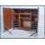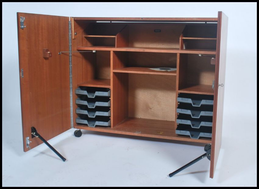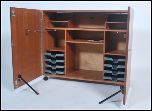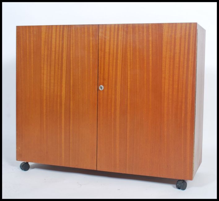 A 1970's retro teak wood office Industrial cube desk - filing cabinet having twin doors, raised on castors with a sectional interior set within. Measures: 84cm high x 102cm wide x 40cm deep.