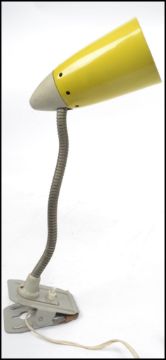 A vintage mid 20th century retro vintage Scandinavian industrial Klippa adjustable desk lamp raised on a clip base with goose neck and conical yellow shade. Measures 39 cm high.