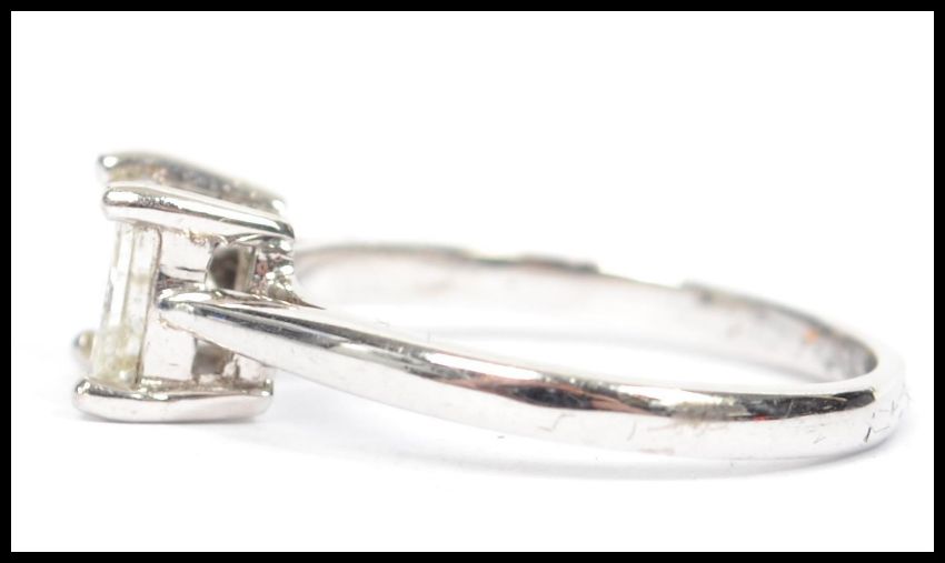 A white gold single stone diamond ring. Princess cut, the diamond approx 75pnts complete in the presentation case. Total weight 3g / Size N