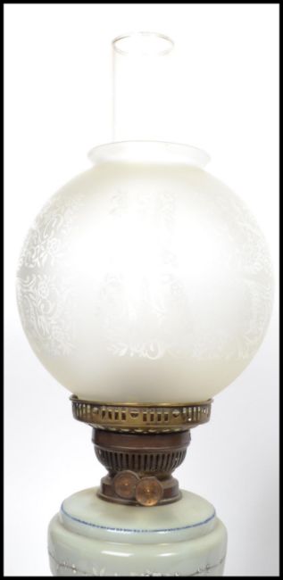 A 19th century brass and glass oil lamp having coloured glass and handpainted stem with similar reservoir. Fitted with glass flue and acid etched shade. Measures 66 cm high.
