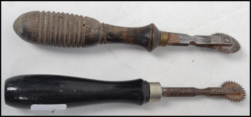Two 18th/19th century Georgian pie pastry crimpers / cutters having turned wood handles. Measures 16cm high.