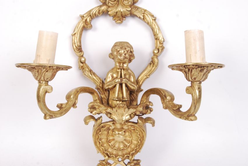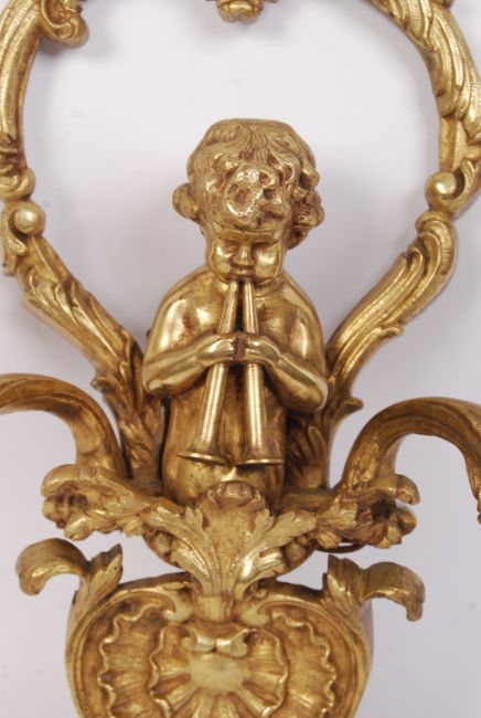 A 19th century Louis 16th style bronze twin fall fitting decorated with shells, leaves and scrolls with cherub putti playing two horns. Measures 35 cm high.