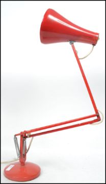 A vintage 20th century retro Herbert Terry 90 anglepoise desk lamp in red with circular base and pendant shade. Measures 92 cm high.