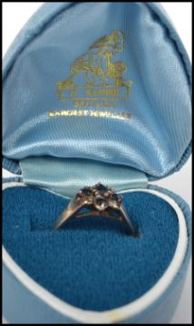 A hallmarked 9ct gold diamond and sapphire cluster ring having five sapphires with four diamonds amid the stones. weighs 2.2 grams size K.