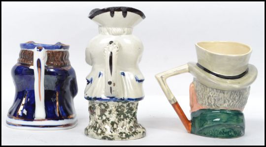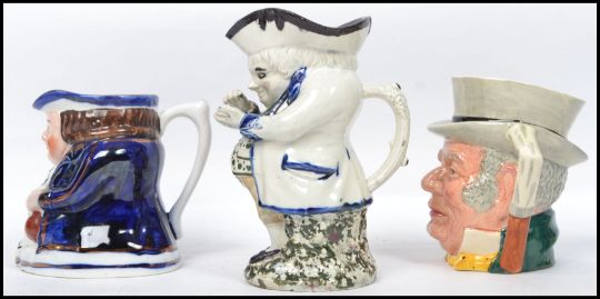 A 19th Century Staffordshire Toby Jug in form of a pot-bellied gentleman taking snuff with black eye and plain jacket along with two other Toby / character jugs by Allertons and Sandland. Highest measures 18 cm, widest measures 14 cm and deepest measures 16 cm.