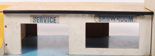 A vintage likely Britains wooden service station play set with carpark & wooden winding car lift. Missing petrol pumps. Measures approx 53cm by 37cm.