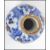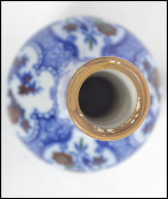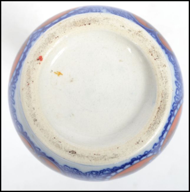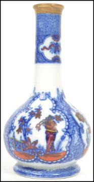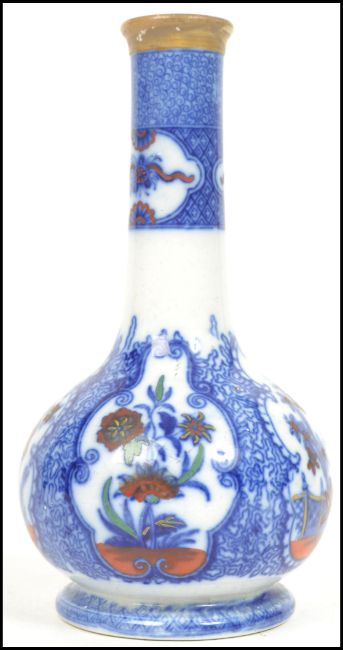A 19th century English blue and white baluster vase having a bulbous body with wasted elongated neck, and white cartouche panels depicting domestic scenes and floral sprays with red and gilt detailing. Measures 17 cm high.