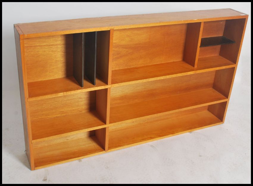 A retro 20th century pine hanging bookshelf unit having varying sized section, unusual construction with some ebonised uprights. measures 91 x 157 x 20