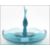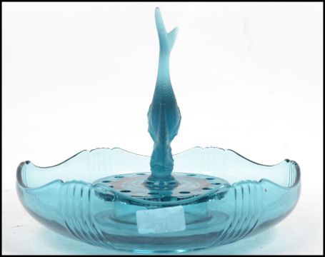 A mid century retro blue glass centre piece comprising bowl with frog centre and dolphin upright. Measures 21 cm high.