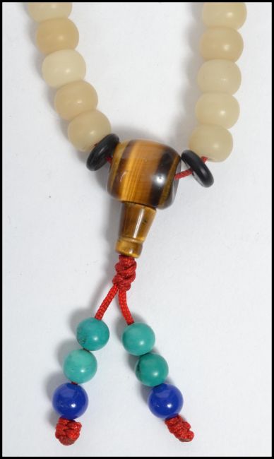 An Oriental carved Chinese jade roundel pendant of circular form mounted on a string necklace along with a Chinese prayer bead necklace having tigers eye stone drop. Longest measures 48 cm.