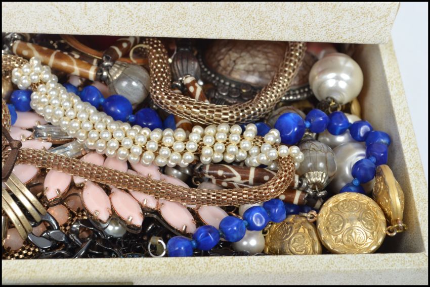 A vintage jewellery box full of vintage 20th century costume dress jewellery to include necklaces, bangles, bracelets etc. Please see images. When closed box measures 9 cm high, 26 cm wide and 18 cm deep.