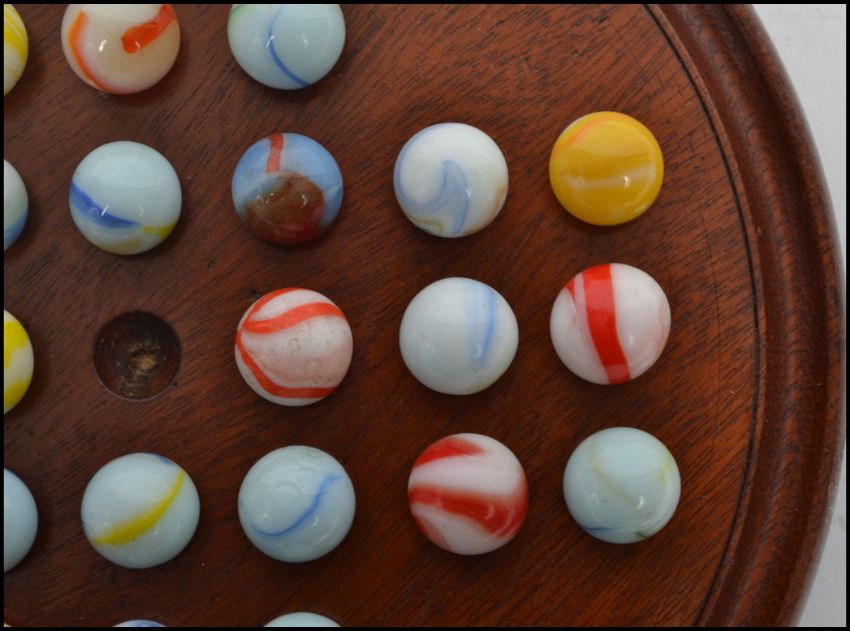A 19th century Victorian glass marble solitaire set with wooden circular board. Measures 21 cm diameter.