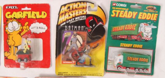A collection of assorted carded diecast models, mostly TV / Film or novelty related, comprising of; Corgi 007 James Bond, Corgi Steady Eddie Stobart models, PC Pinkerton by ERTL, ERTL Postman Pat, Cars, Garfield, Batman Action Masters, Looney Tunes, etc
