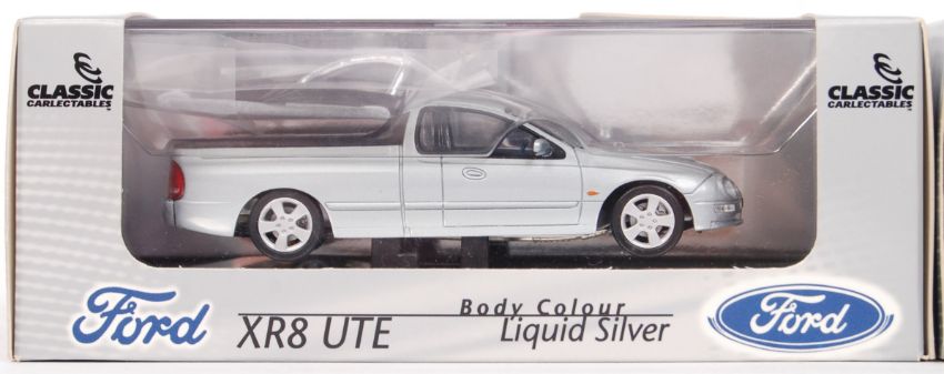 Two 1:43 scale Classic Carlectables Ford diecast model trucks to comprising of; Citric Acid colour Ford BA XR8 UTE truck & Liquid Silver colour XR8 UTE truck. Both mint & within their original plastic cases with outer card sleeves.
