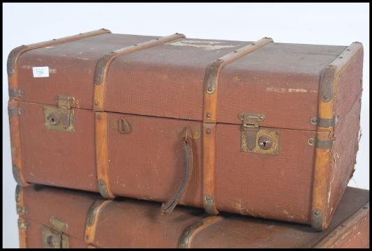 A pair of vintage 20th century canvas and wooden bound steamer trunks with locks and claps to front with hinged lids opening to reveal spacious interiors. Measures 76cms x 29cms.
