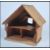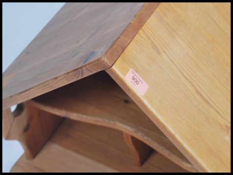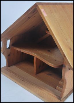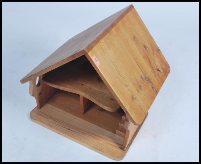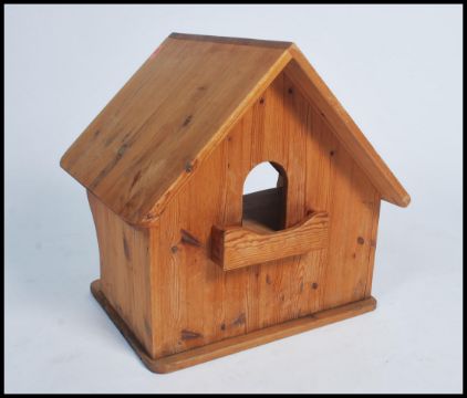 An unusual 20th century pine bird table in the form of a house having a pitched roof with interior and stairs, hole to base for pole