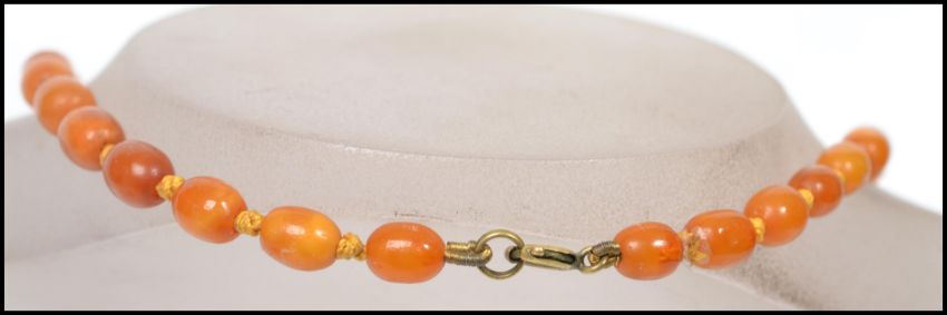 A 19th century knotted butterscotch amber necklace having 53 graduated beads with a bolt ring clasp. Total weight 38.5 grams largest bead measures 2.2cms and total length is 30 inches.