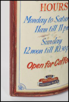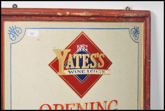 A retro 20th century pub sign for Yates wine bar, the bow front metal / tin sign listing opening hours and days. Please refer to images. Measures: 120cm high x 62cm wide x 15cm deep.