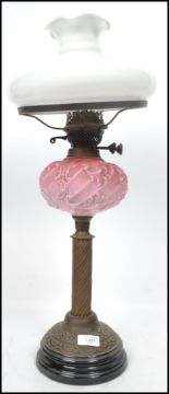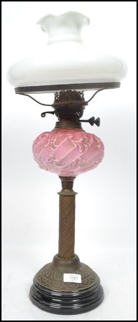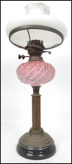 A 19th century Victorian oil lamp raised on a stepped circular base with readed column cranberry glass recess and brass supports, with twin pusher duplex burner and milk glass shade. Measures 63 cm high.