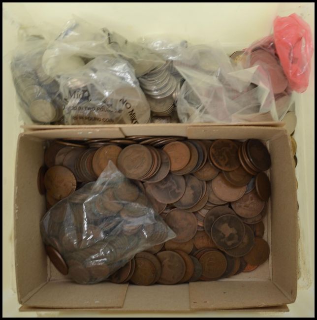 COINS. Large quantity 6.5Kg: British Copper ¼d, ½d & 1d (2.4Kg) British 1s & 2s etc (1Kg),British obsolete Decimal silver (1.575Kg) Mixed foreign (1.6Kg).