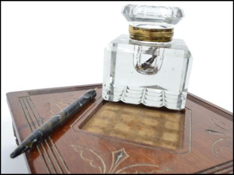 A stunning Victorian 19th century desk top mahogany aesthetic movement oversized ink well, the oversized cut glass inkwell with hinged lid set upon an aesthetic movement base raised on four bracket feet with pierced lattice frieze. Measures 20 cm high, 25 cm wide and 25 cm deep.