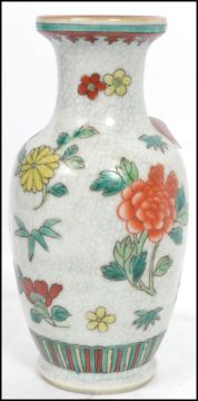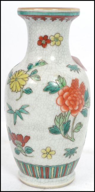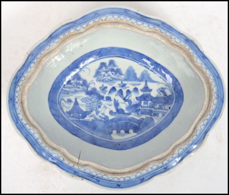 A Chinese crackle glaze vase decorated with foliate and peonies together with a 19th century Chinese blue and white glazed dish of scalloped form with traditional scenes to base. Highest measures 17 cm, widest measures 26 cm, deepest measures 22 cm.