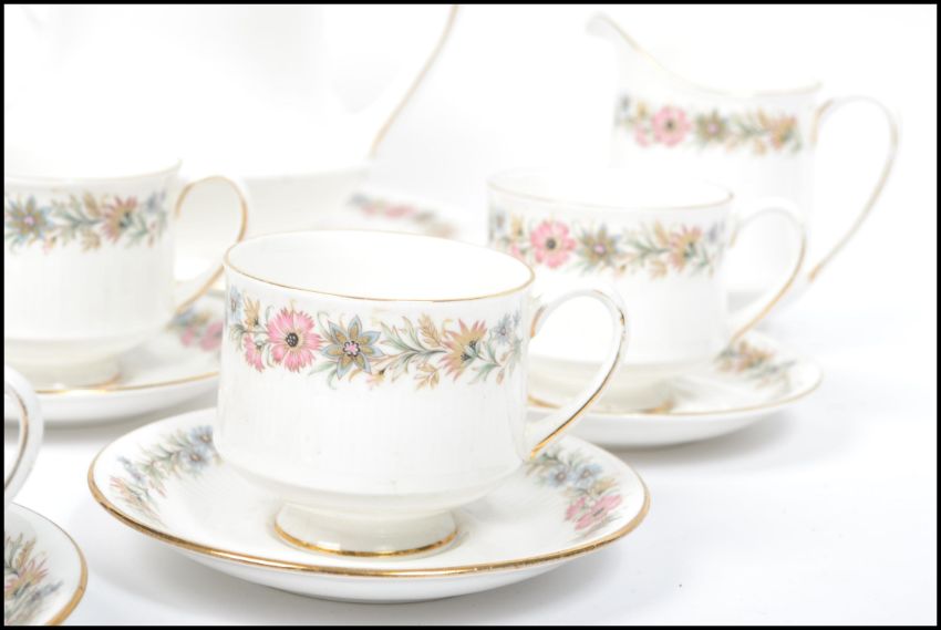 A vintage 20th century Paragon Belinda china tea service consisting of cups, saucers, side plates, creamer jug, sugar bowl, cake plate and teapot.