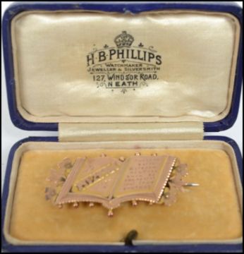 A 9ct gold Mizpah brooch inscribed ' The lord watch between thee and me, we are absent one from another ' Marked 9ct to verso, with pin and in presentation box. Length 4cms - weight 2.7g