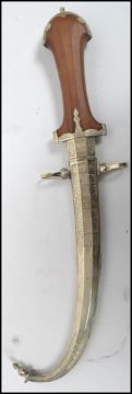An early 20th century curved Islamic Jambiya dagger, the sheaf decorated with medallions and swirls and the wooden handle adorned with white metal details. Measures 42 cm long.