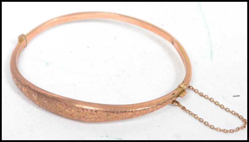 A hallmarked 9ct bracelet bangle having a half engraved decoration with safety chain. Weighs 4 grams.