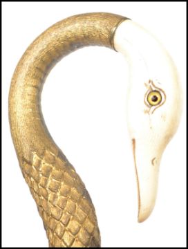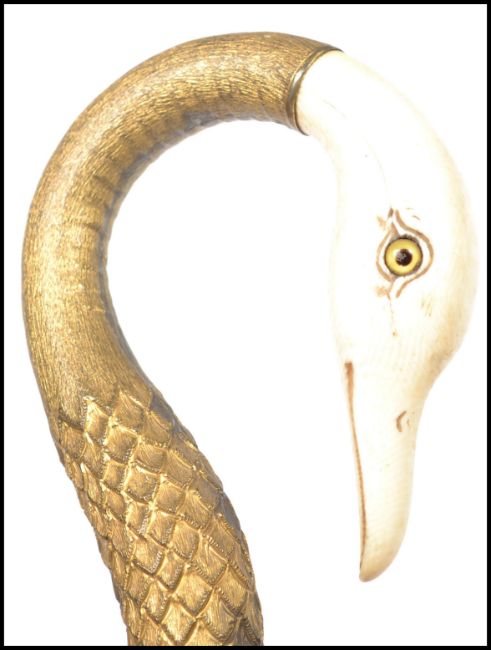 A stunning early 20th century Edwardian gentleman's umbrella, the handle in the form of a Swans head carved from ivory with inset glass eyes, mounted on a highly detailed gilt metal body. Together with a silver collared walking cane. Measures 95 cm long.