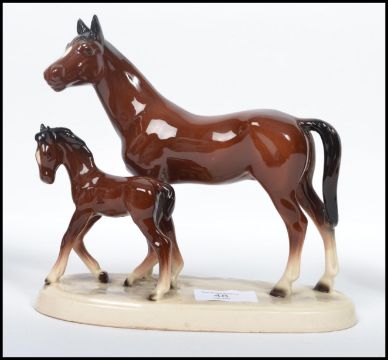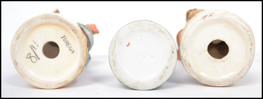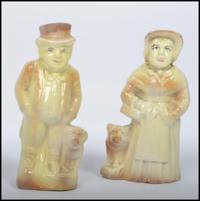 A collection of vintage ceramic figures dating from the 19th century to include a pair of vintage winter snow children, John Bull and wife figures and a continental horse and foal figurine group and candlestick figurine with crown and s mark to base 26123. Highest measures 18 cm and widest measures 21 cm.
