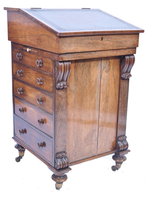 A 19th century rosewood davenport desk raised on bun castors having upright pedestal with faux bank of drawer to left, real bank of drawers to the right. Above a hinged ' pull forward ' desk top with tooled leather skiver, secret compartment verso and slide out candle stand to the right. Measures 74cm high x 56cm wide.