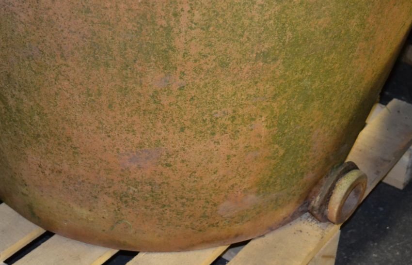 NOTE: consigned from a local property where they have been used as architectural garden features since the mid 1960's. The vendor's father worked at a Bristol metal work factory, where it is believed these contained Zinc. Upon their release from the factory they were brought home, and pulled into place by the families Morris Minor. There they have remained until they were consigned to auction. The final photographs show an original Doulton & Co of Lambeth advertisement for this style of stoneware pot.