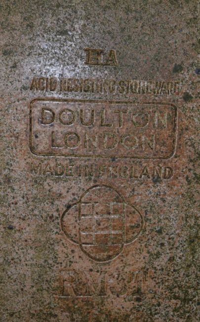 An incredible 5ft high mid-20th century c1940's Doulton Stoneware large oversize factory Chemical or Acid vat collecting jar / urn / pot. Constructed of thick heavy stoneware, and stamped for ' Doulton & Co, London ,' to the front along with various other stamps. Large screw threads still remain to the top. Measuring approx 153cm (5ft) tall.