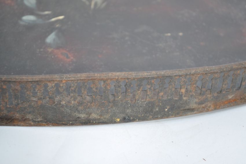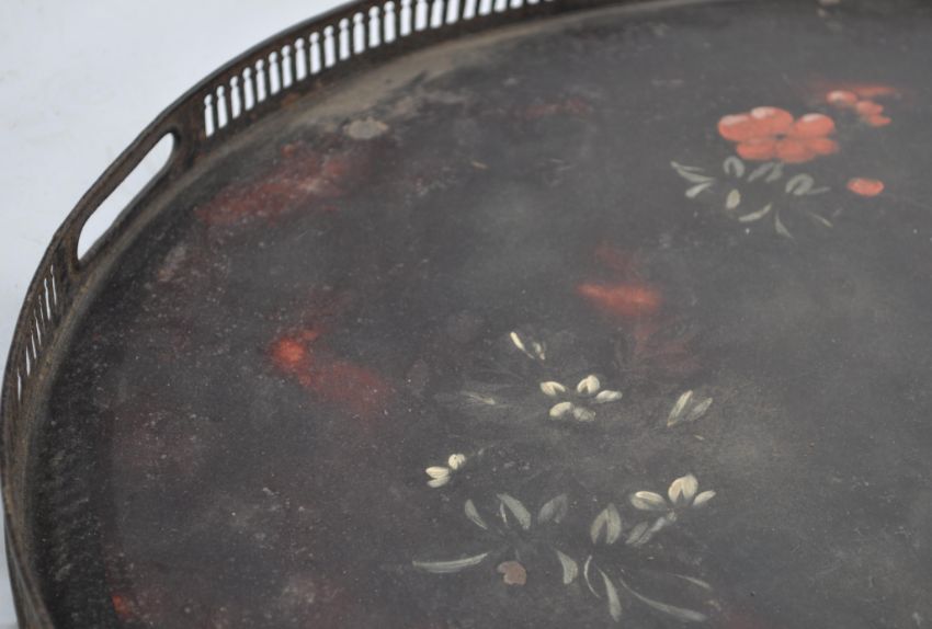 A late 18th century Georgian Pontypool Japanned tray of oval form having a black ground with painted floral sprays, the raised metal sides with pierced decoration and open handles. 79cm tall.