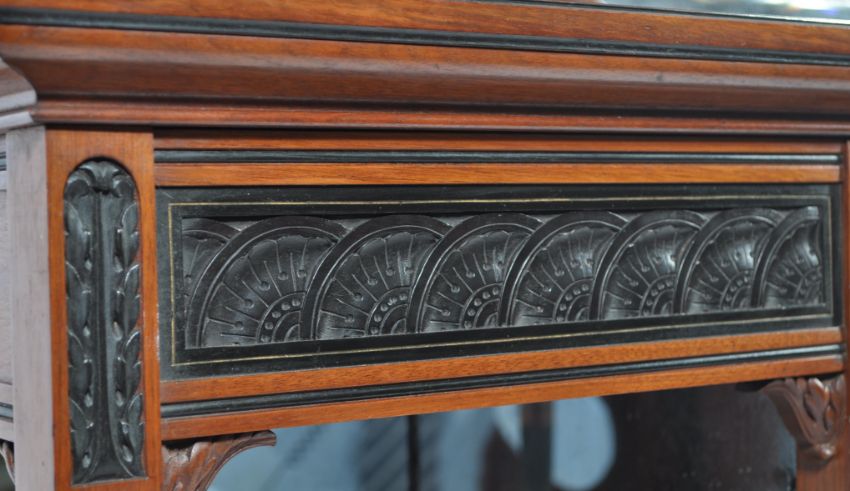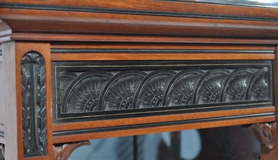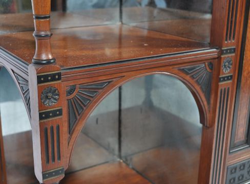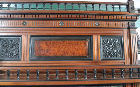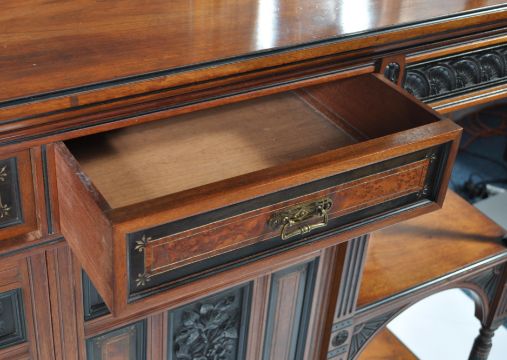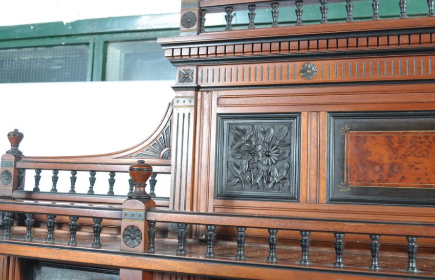A late 19th century Victorian exhibition quality thuya wood, ebony and walnut  mirror back sideboard / chiffonier in the Aesthetic taste and of Lamb of Manchester manner. Exquisite baluster spindle gallery details and columns to the base and upright. Raised on turned legs, reeded square uprights and twist columns having mirror back lined shelves flanking the central fielded ebony inset panels. Above, the upright back with further column work and spindle galleries having an arched fielded top. Measures 205cms high x 167cms wide x 43cms depth