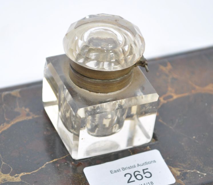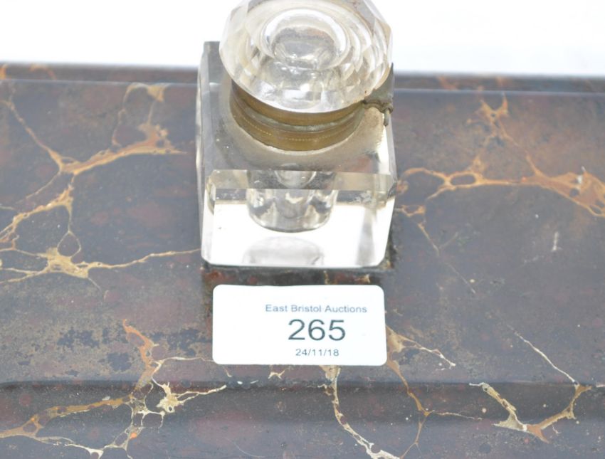 A 19th century Victorian Gentleman's marble 3 piece desk tidy set comprising a pair of marble blotters and a rectangular desk tidy with pen recess and glass inkwell. Measures 5cm high x 9 1/2 cm wide.
