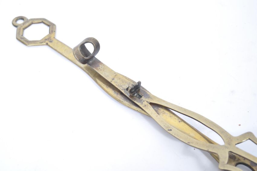 An early 19th century Georgian brass chestnut roaster of circular form depicting a Dutch Master David Teniers scene of two gentlemen having pierced sides and dotted base. The shaped handle having a locking arm which opens the hinged lid. Measures 60cms long