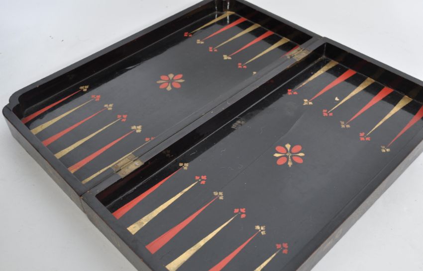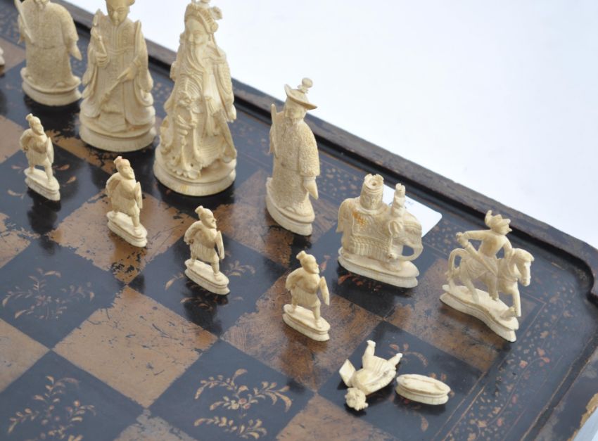 A 19th century Chinese - Canton carved ivory chess set in natural and stained red colourway complete with the black chinoserie decorated chess board box. The set with well carved figures including knights on horseback and castles mounted on elephants etc ( the set being within the vendors family for over 70 years ). Measures 48cm wide x 25cm high.